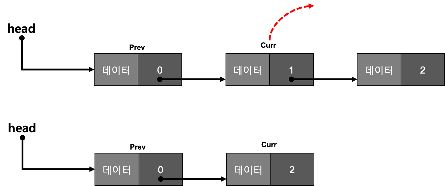๊ทธ๋์ curr ๋ ธ๋์ ๋ฐ์ดํฐ๊ฐ ๋งค๊ฐ๋ณ์์ ๊ฐ์ผ๋ฉด prev์ ๋ค์ ๋ ธ๋๋ฅผ curr์ ๋ค์ ๋ ธ๋๋ก ์ฐ๊ฒฐํ๊ณ , curr์ ๋ค์ ๋ ธ๋๋ฅผ null๋ก ์ฐ๊ฒฐํ์ฌ ๋์ด์ค๋ค.